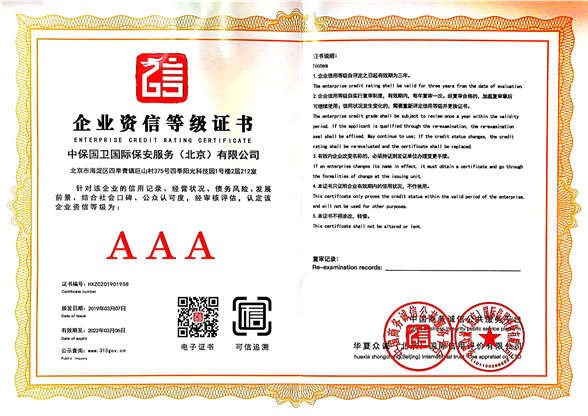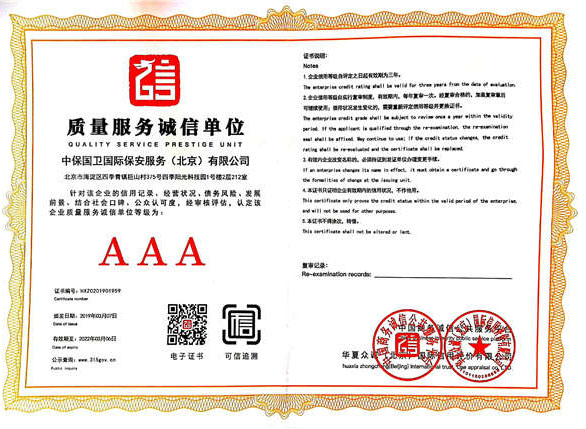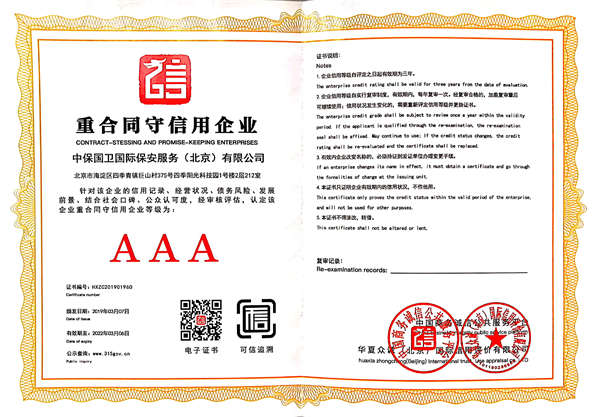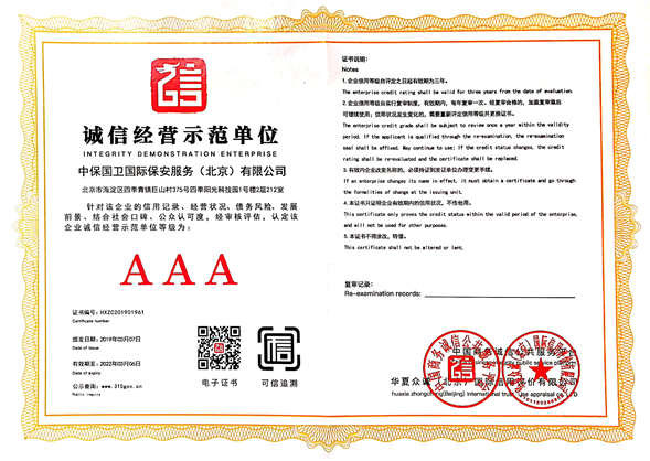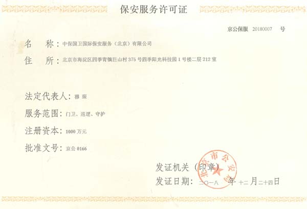 中保國衛(wèi)國際保安服務(北京)有限公司,屬中保國衛(wèi)集團旗下子公司。能全方位的為大型客戶提供優(yōu)質的安保、押運服務,是集人防和技防于一體的新型正規(guī)化綜合安保押運服務企業(yè),提供人防、物防、技防、聯(lián)網(wǎng)報*、非武裝押運等安防相關的一站式服務。 公司在國內(nèi)多省設立有分公司及分支機構,著重提升安全押運、智能技術押運及安全技術防范相關的服務,業(yè)務范圍覆蓋全國一、二線城市、港澳地區(qū)以及海外地區(qū)。安保方面主要為政府機構、金融機構、企事業(yè)單位、醫(yī)療衛(wèi)生、高等院校、工業(yè)園區(qū)、大型商場、高檔住宅、智能商務樓、大型活動提供門衛(wèi)、守護、巡邏、押運(非武裝)、安全檢查、保安特勤、私人護衛(wèi)、消防中控、安全技術防范、遠洋護航等全方位服務,同時面向國際市場,為中資企業(yè)在“一帶一路”沿線國家投資提供境外安保服務。 >> 更多內(nèi)容 |